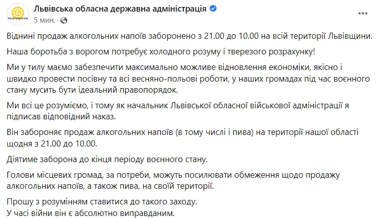 20:18 Мэр Львова Садовой заявил, что в городе продолжится полный запрет на продажу спиртного.