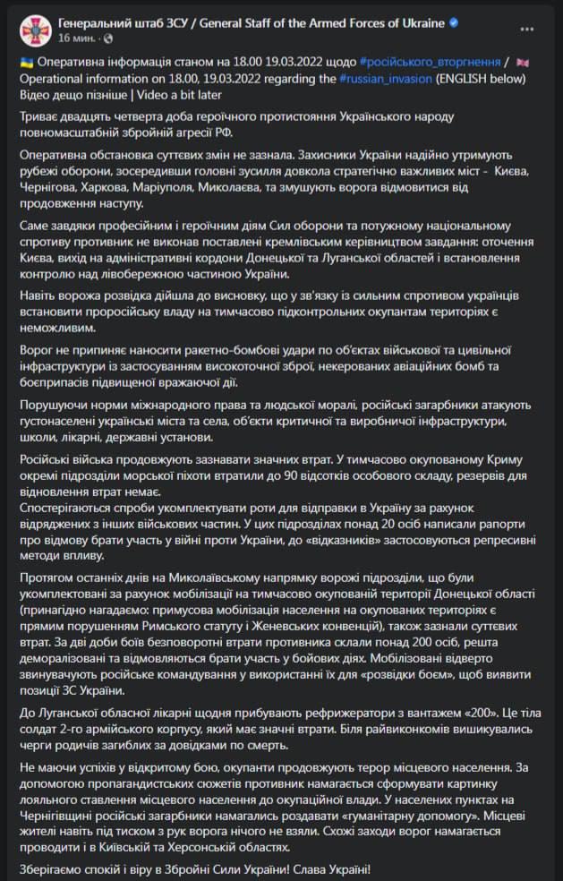 06.45 Ночью Генштаб выпустил подробную сводку боевых действий за 18 марта.