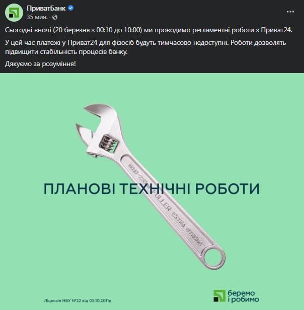 "Во время проведения технических работ 20 марта с 00 часов до 10 утра запланирована технологическая пауза в проведении платежей через мобильную и веб-версию Приват24 для физических лиц", - сообщили в "Приватбанке".