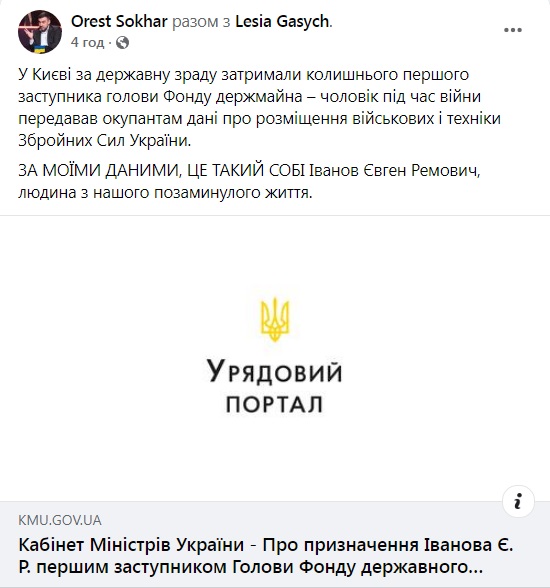 "В Киеве за государственную измену задержали бывшего первого заместителя главы Фонда госимущества – мужчина во время войны передавал оккупантам данные о размещении военных и техники Вооруженных Сил Украины. По моим данным, это некий Иванов Евгений Ремович, человек из нашей позапрошлой жизни", - написал Сохар.