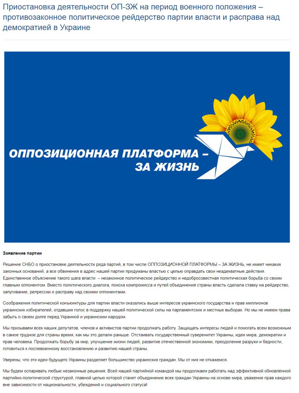 Партия "Оппозиционная платформа - За жизнь" отреагировала на решение СНБО и президента Украины Владимира Зеленского запретить ее деятельность на время военного положения, назвав его "незаконным политическим рейдерством".