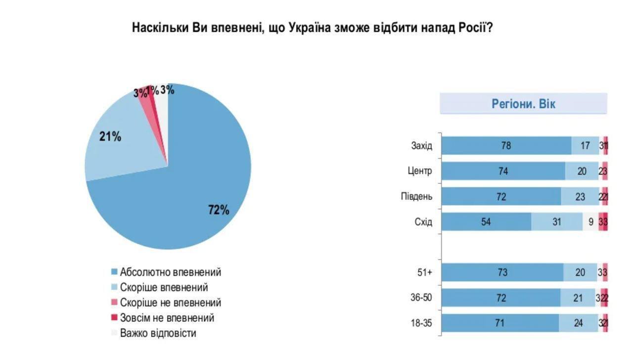 93% украинцев верят в то, что Украина сможет отразить нападение России. Из них 72% абсолютно уверены в этом, а 21% - скорее уверены.