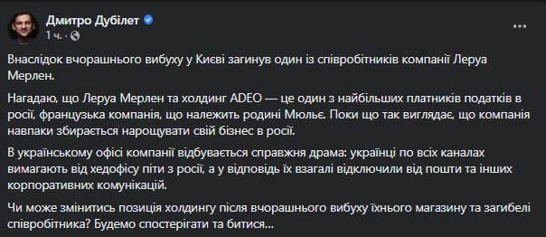 В результате ракетного удара по Киеву погиб сотрудник "Леруа Мерлен". Эта компания все еще работает в России