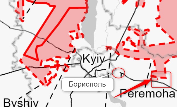 Судя по карте Института изучения войны (США), угроза наступления на Борисполь есть как с севера, так и с востока, где под Березанью (50 км от Борисполя) противник приблизился к трассе на Полтаву и Харьков.