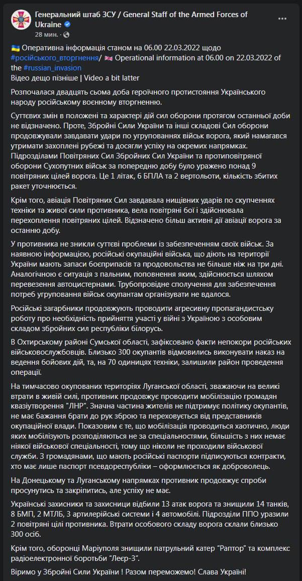 Свежая сводка Генштаба ВСУ по итогам 22 марта 2022 года