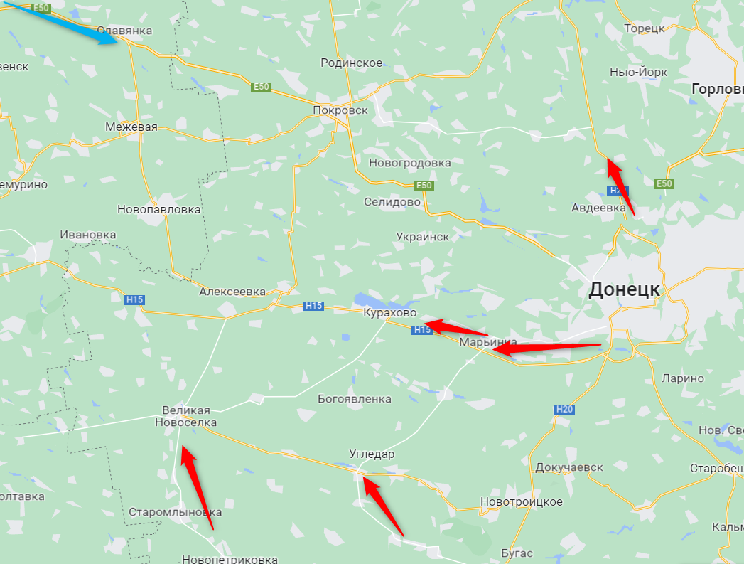 То есть мы видим попытку отрезать украинским силам, сконцентрированным у Донецка, все пути снабжения и связи с тылом. При этом дорога на Покровск и через него - в Павлоград на данный момент полностью свободна (ее можно бомбить только с воздуха).