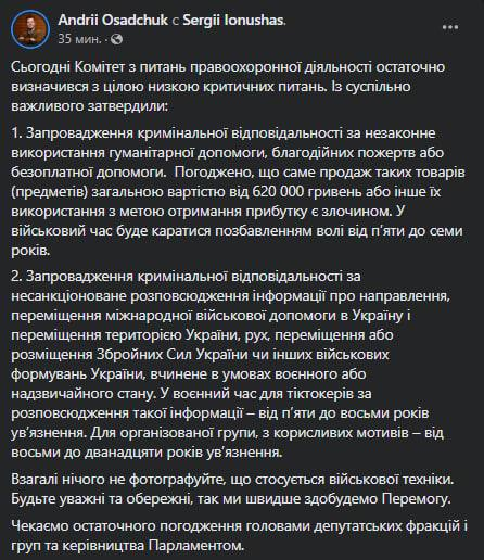 Согласно заявлению Осадчука, за распространение подобной фото- или видеоинформации будет введено уголовное наказание – от пяти до восьми лет тюрьмы.