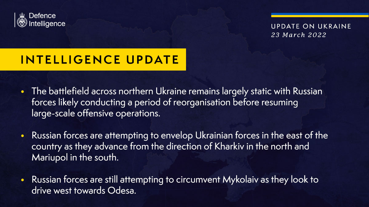 "Поле боя на севере Украины остается в значительной степени статическим, поскольку российские силы, вероятно, проводят реорганизацию, прежде чем возобновить крупномасштабные наступательные операции", говорится в твиттер британского ведомства.