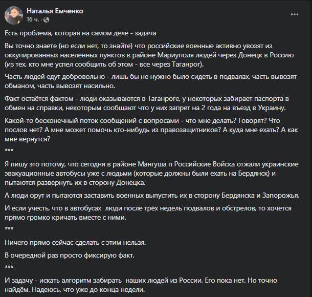 "Ничего прямо сейчас сделать с этим нельзя. В очередной раз просто фиксирую факт. И задачу - искать алгоритм забирать наших людей из России. Его пока нет. Но точно найдём. Надеюсь, что уже до конца недели", - сообщила Емченко.