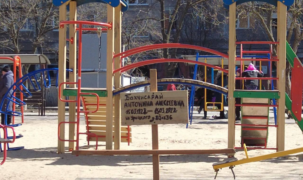 Вокруг детской площадки с могилами стоят многоэтажки со следами многочисленных обстрелов.