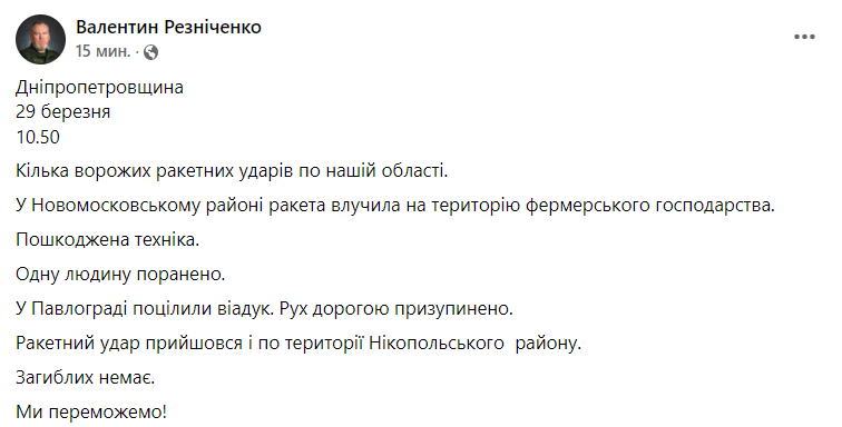 "Несколько вражеских ракетных ударов по нашей области. В Новомосковском районе ракета попала на территорию фермерского хозяйства. Поврежденная техника. Один человек ранен. В Павлограде попали в виадук. Движение по дороге приостановлено. Ракетный удар пришелся по территории Никопольского района. Погибших нет. Мы победим!" - написал Резниченко.
