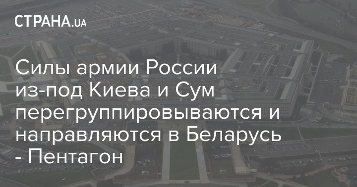 Министерство обороны США заявило, что за последние 24 часа наблюдает, как около 20% российских войск, двигавшихся к Киеву, переориентировались, а части, находившиеся под Сумами и Черниговом, направились в Беларусь.