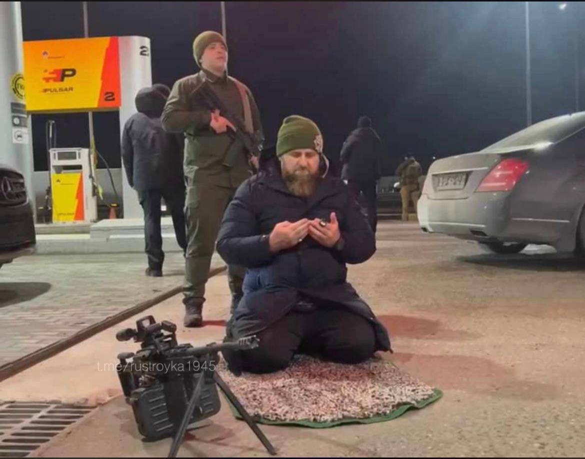 Также в российских телеграм-каналах появилось фото Рамзана Кадырова, где он совершает намаз на улице, рядом с пулеметом с подписью, что это Кадыров на Донбассе.