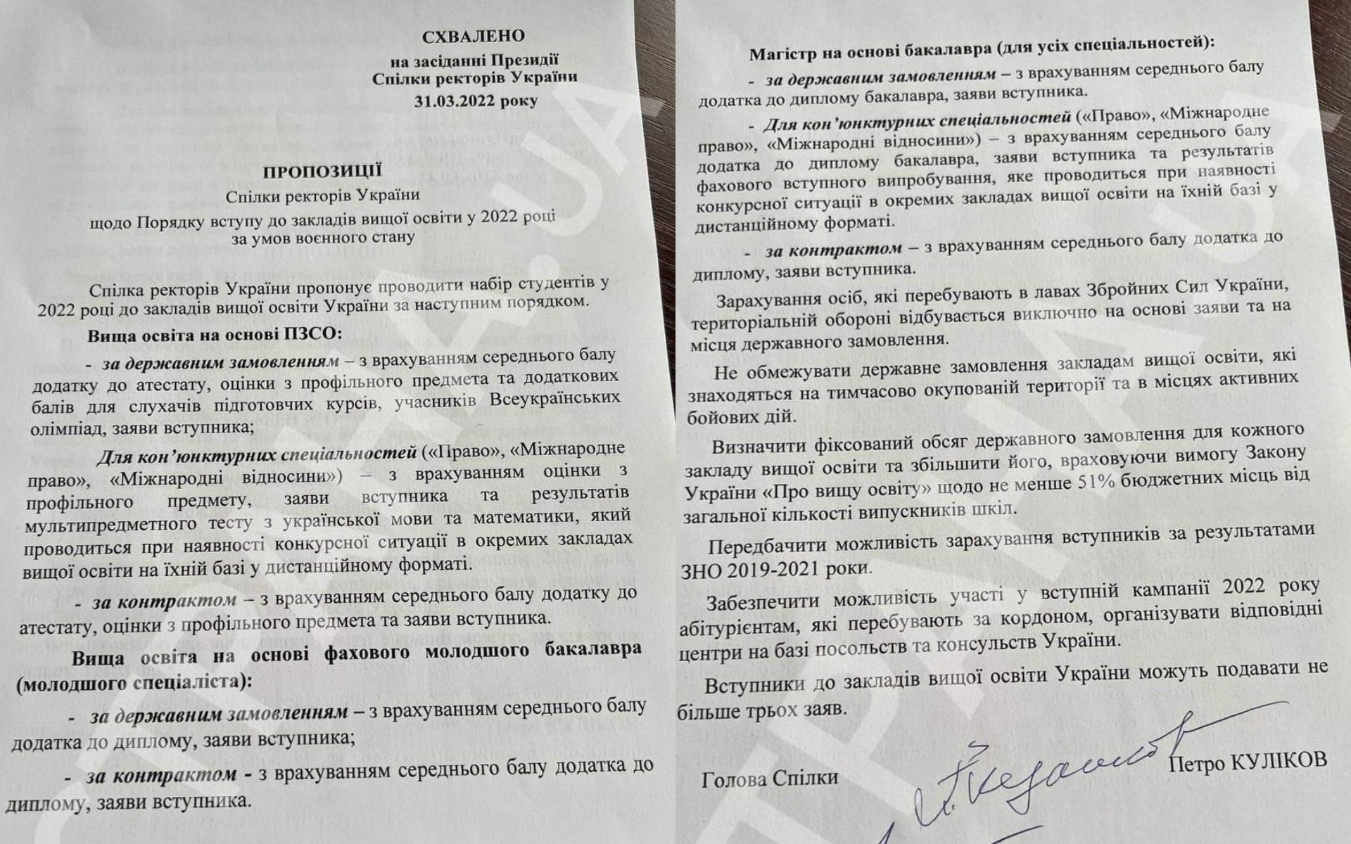 11.00 В распоряжении "Страны" оказались предложения союза ректоров Украины насчет Порядка вступления в ВУЗы в 2022 году в условиях военного положения. В документе предлагается зачислять лиц, которые служат в ВСУ и теробороне исключительно на основе заявления и на места госзаказа.