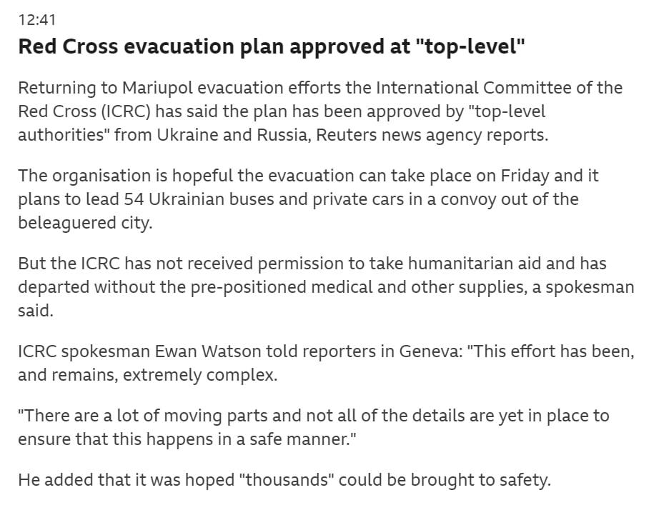 План "Красного Креста" по эвакуации из Мариуполя утвержден "высокопоставленными властями", сообщает BBC.