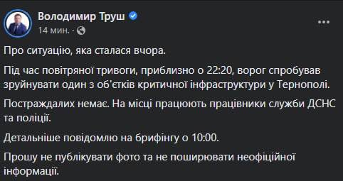 09.40 В Тернополе вчера в 22:20 российские войска ударили по одному из объектов критической инфраструктуры.