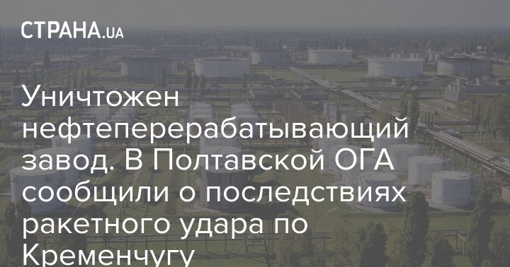 Губернатор Полтавской области Дмитрий Лунин заявил, что Кременчугский нефтеперерабатывающий завод (НПЗ) уничтожен вследствие ракетного удара сегодня ночью.