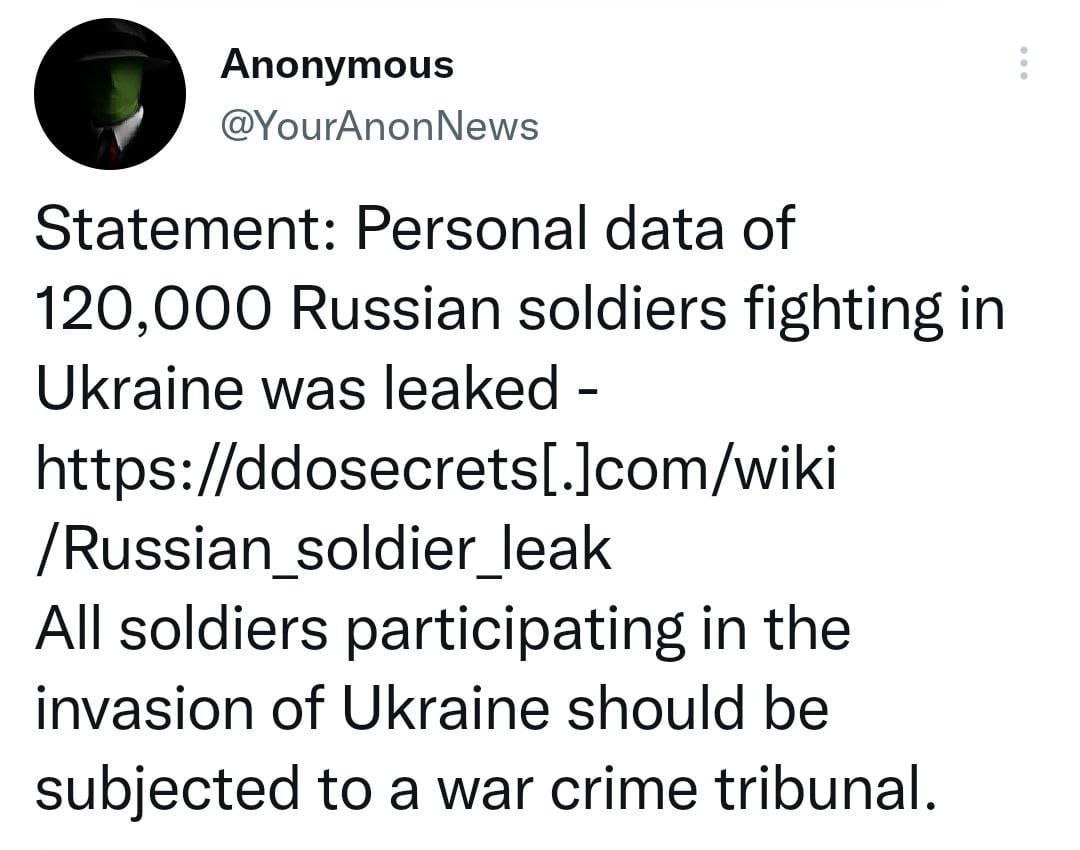 Хакерская группировка Anonymous выложили в общий доступ личные данные 120 тысяч солдат и офицеров ВС РФ, участвующих в войне против Украины.