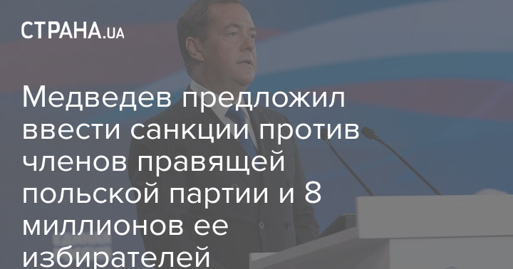 Заместитель главы Совета безопасности РФ Дмитрий Медведев отреагировал на идею премьер-министра Польши Матеуша Моравецкого наложить санкции на всех членов российской провластной партии "Единая Россия".
