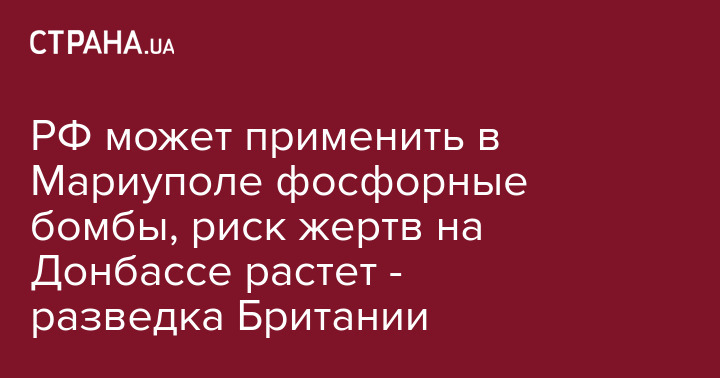Британская разведка сообщает, что войска РФ продолжают обстреливать Донбасс, увеличивается риск жертв среди гражданского населения. Повышается вероятность использования Россией фосфорных боеприпасов в Мариуполе.