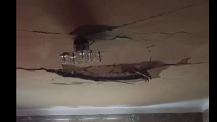 На кадрах видно, что в жилой квартире ракета пробила плиту потолка и осталась там.