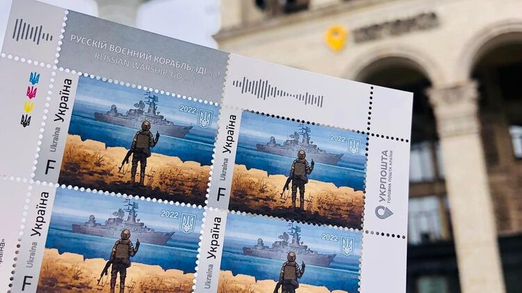 Напомним, 12 апреля "Укрпочта" выпустила марки с фразой "Русский военный корабль иди ...!". На иллюстрации изображен морской пехотинец, показывающий недружественный жест военному кораблю, а внизу фраза, ставшая крылатой после употребления украинскими военными с острова Змеиный.