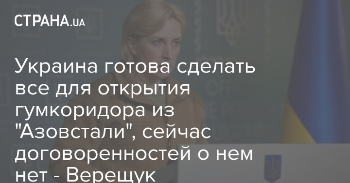 Украина готова сделать всё для открытия гумкоридора из "Азовстали" в Мариуполе. Об этом заявила вице-премьер Ирина Верещук.
