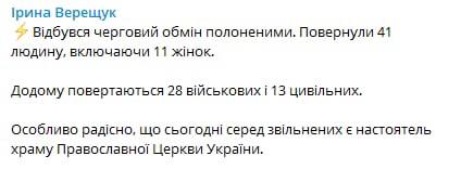 Сегодня состоялся очередной обмен пленными, в ходе которого вернули 41 пленного, в том числе 11 женщин. Домой возвращаются 28 военных и 13 гражданских. Среди освобожденных есть настоятель храма ПЦУ.