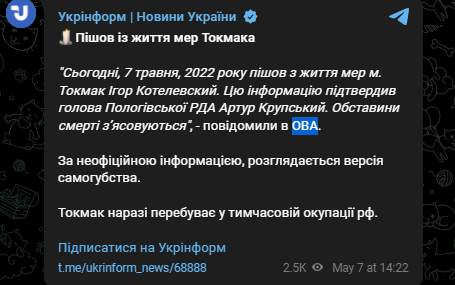 "Сегодня, 7 мая, 2022 года ушел из жизни мэр Токмака Игорь Котелевский. Эту информацию подтвердил глава Пологовской РГА Артур Крупский. Обстоятельства смерти выясняются", – заявили в Запорожской ОГА.