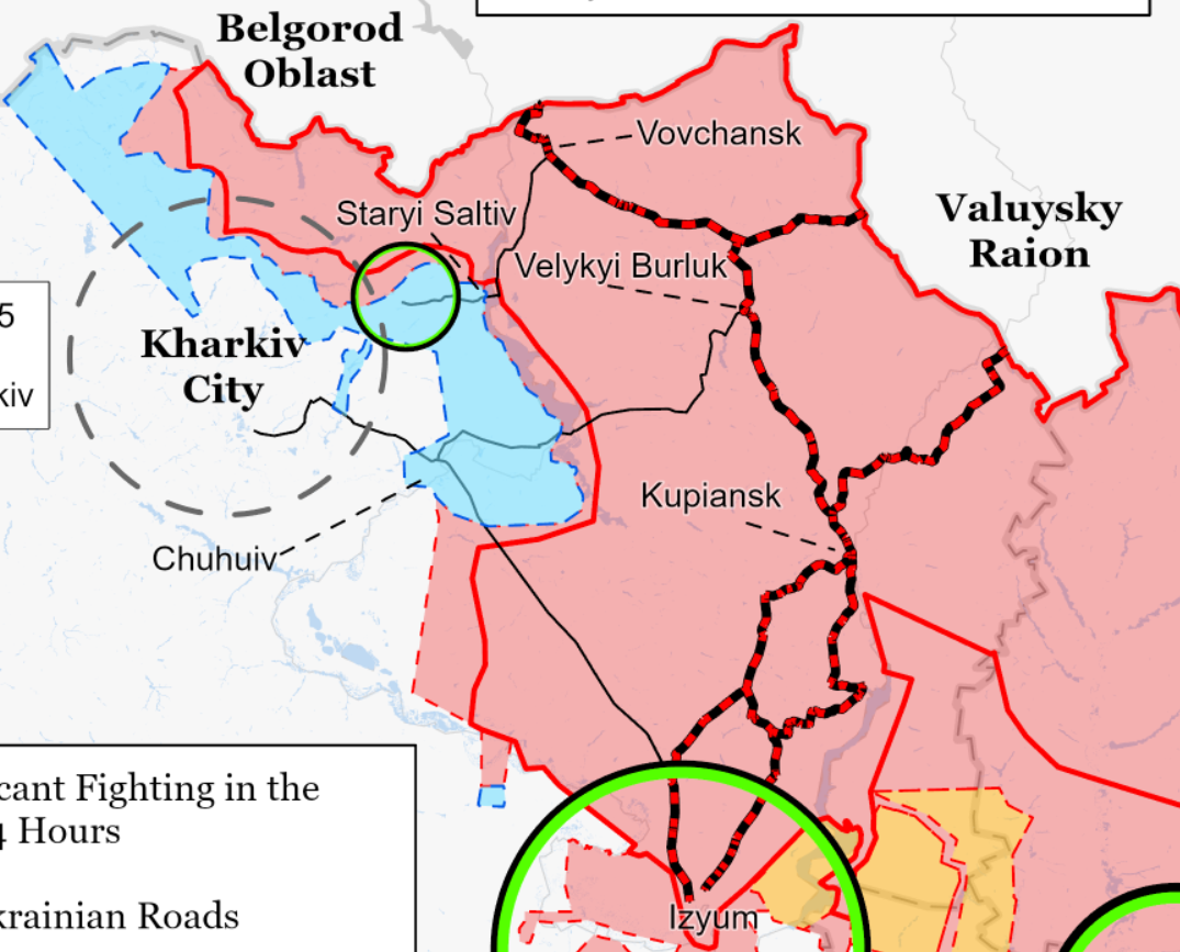 По его данным, украинское контрнаступление по дуге к северу и востоку от Харькова расширилось. Институт выдвигает гипотезу, что в ближайшие дни ВСУ отодвинут российские войска дальше от города, и Харьков окажется вне зоны досягаемости ствольной российской артиллерии.