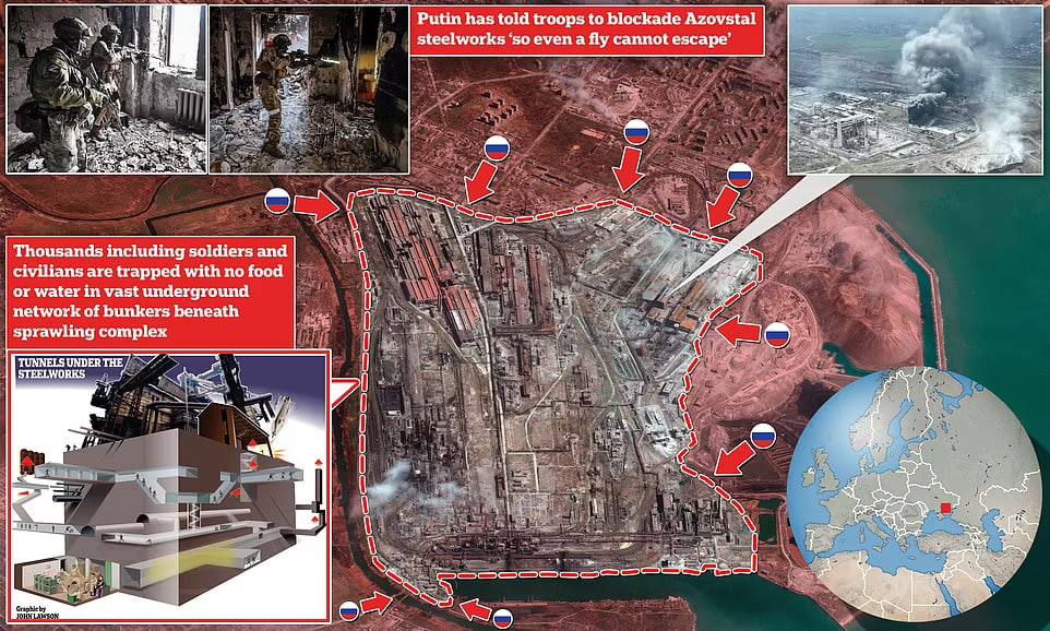 Штурм завода, по данным Daily Mail, идет с трех направлений - из промзоны на севере, со шлаковых отвалов на востоке и из порта на юге.