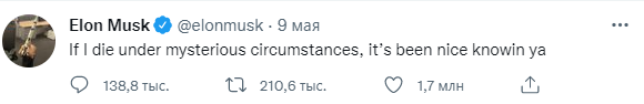 Вчера утром Маск оставил сообщение следующего содержания: "Если я умру при загадочных обстоятельствах, было приятно познакомиться".