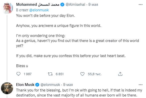 • "Ты не умрешь раньше своего дня, Илон. В любом случае, вы являетесь/были уникальной фигурой в этом мире. Меня интересует только одно: Как гений, разве ты еще не узнал, что есть великий создатель этого мира? Если да, обязательно признайтесь в этом до последнего удара сердца. Будь здоров", - написал пользователь с ником Мухаммед.