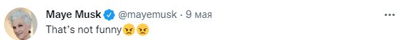 В ответ на этот твит его 74-летняя мать Мэй Маск, написала: "Это не смешно" и добавила два злобных смайлика.