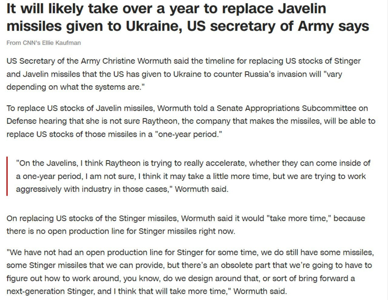 Что касается замены запасов ракет Stinger в США, Вормут сказала, что это займет больше времени, потому что сейчас нет производственной линии для таких ракет.