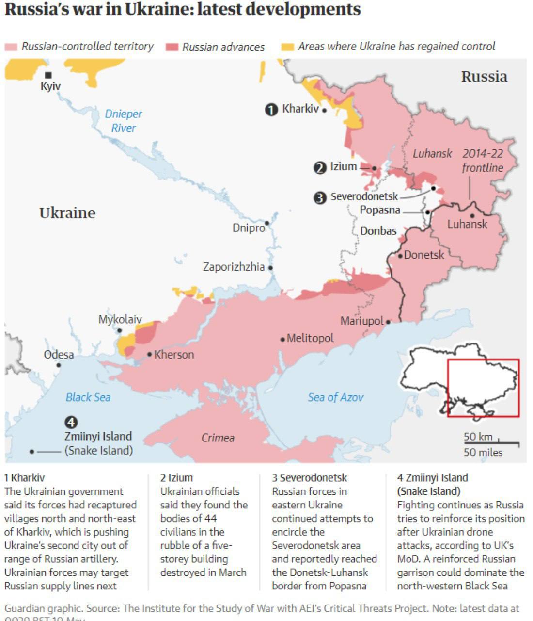 1. Продолжаются бои на острове Змеиный, где Россия пытается усилить свой слабо защищенный гарнизон.