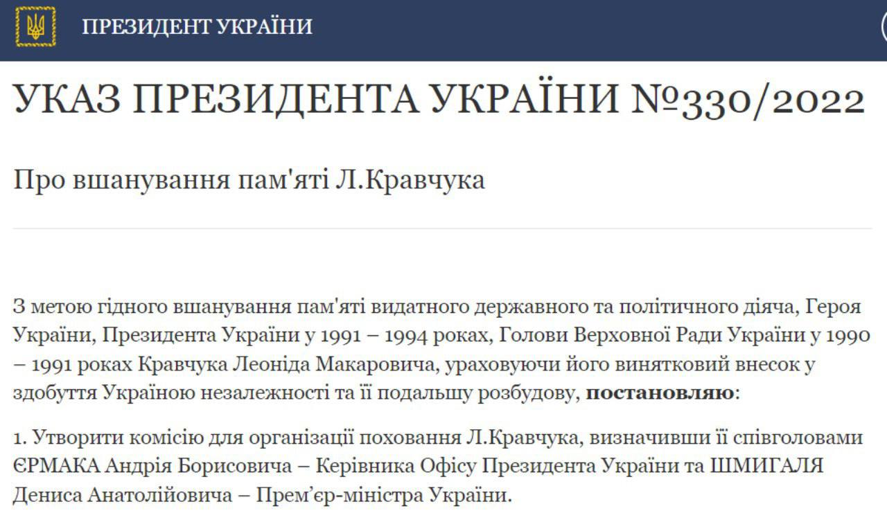 Кабмину поручено обеспечить осуществление мер по погребению Кравчука, а также разработать и утвердить план мероприятий по увековечиванию его памяти.