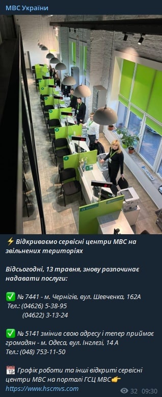 МВД возобновляет работу сервисных центров на освобожденных территориях. В частности, открываются сервисные центры в Чернигове и Одессе, где еще продолжаются обстрелы. Об этом пишет официальный Телеграм-канал МВД Украины.