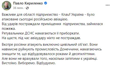 "Они намеренно уничтожают промышленность Донецкой области, пытаясь разрушить то, что восстанавливалось годами и десятилетиями", - написал он.