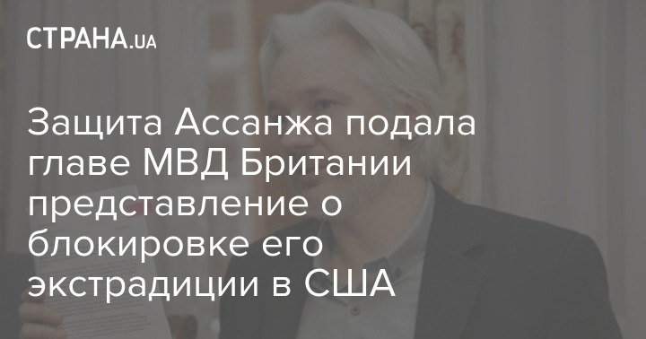 Защита основателя Wikileaks Джулиана Ассанжа подала главе МВД Британии представление о блокировке его экстрадиции в США. Об этом написала супруга Ассанжа Стелла Морис в Twitter.
