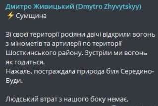 Сообщается, что самый продолжительный обстрел длился около часа. Его россияне вели из минометов со стороны села Зерновое по территории вблизи одного из приграничных населенных пунктов Шосткинского района Сумской области.