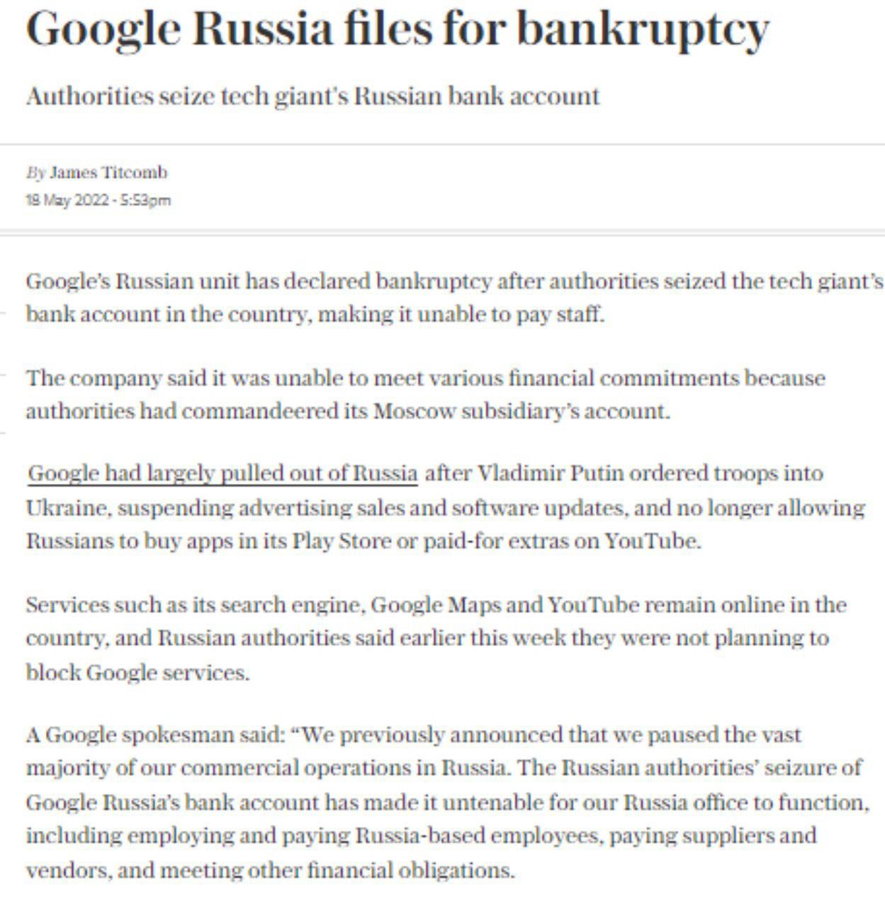 В связи с арестом счета "дочка" Google в России подала на банкротство.