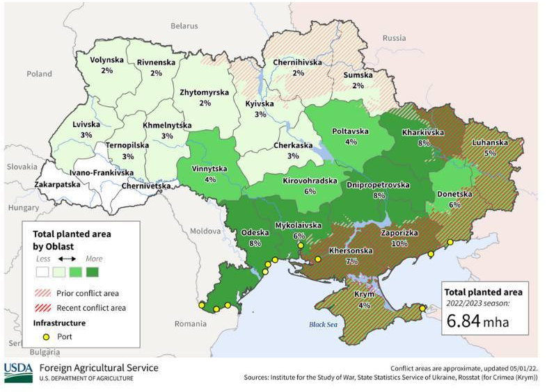 Сообщается, что снижение производства из года в год связано с продолжающимся вторжением России в Украину. Обрабатываемая площадь уменьшилась на 21% по сравнению с 2021 годом, а урожайность прогнозируется на уровне 3,68 тонны с гектара, что на 18 процентов меньше, чем в прошлом году.