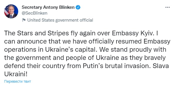 "Звездно-полосатый" снова парит над посольством в Киеве. Могу сообщить, что мы официально возобновили работу посольства в столице Украины. Мы гордимся тем, что правительство и народ Украины храбро защищают свою страну от жестокого вторжения Путина. Слава Украине!", - написал Блинкен.