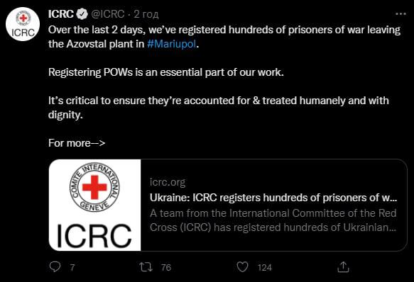 "В последние два дня мы зарегистрировали сотни военнопленных, которые покидают завод "Азовсталь" в Мариуполе. Регистрация военнопленных является важной частью нашей работы. Очень важно, чтобы с ними обращались гуманно и достойно", - говорится в сообщении МККК.