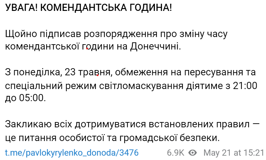 "Только что подписал распоряжение об изменении времени комендантского часа в Донецкой области. С понедельника, 23 мая, ограничение на передвижение и специальный режим светомаскировки будет действовать с 21:00 до 05:00", - написал Кириленко.