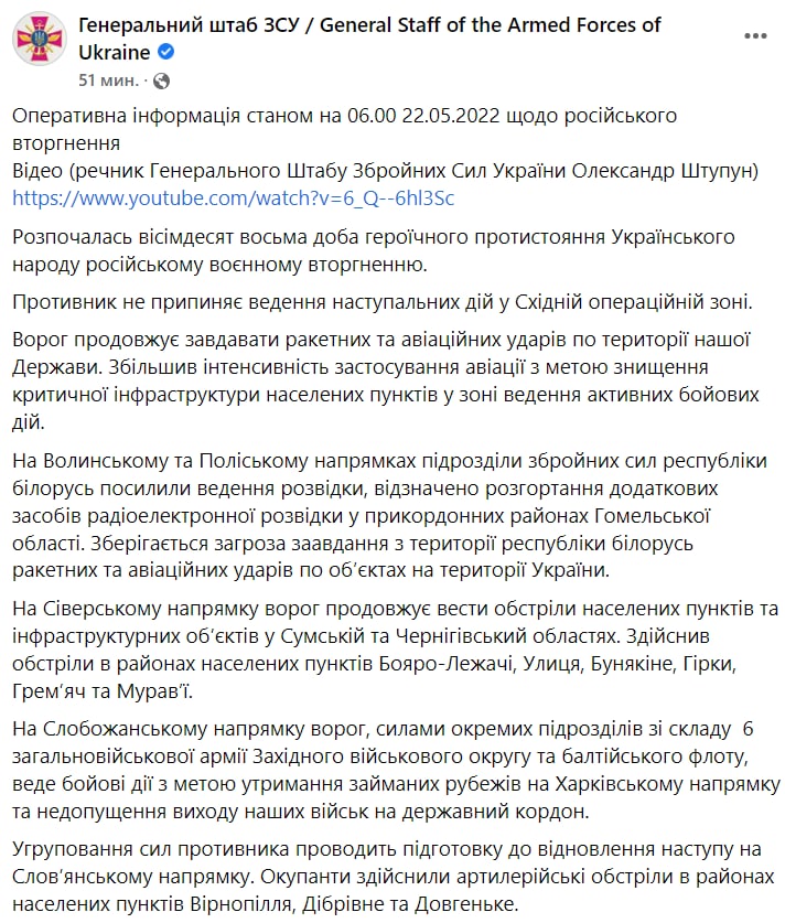 Главный фронт сейчас - Северодонецк. В обеих сводках Генштаба о нем почти ничего не говорится. Но губернатор Сергей Гайдай сообщил две важные новости. Первая - что бои уже второй день идут на окраинах Северодонецка. Вторая - что россияне подорвали Павлоградский мост между Северодонецком и Лисичанском.  Генштаб резюмирует, что враг пытается выйти на административные границы Луганской области.