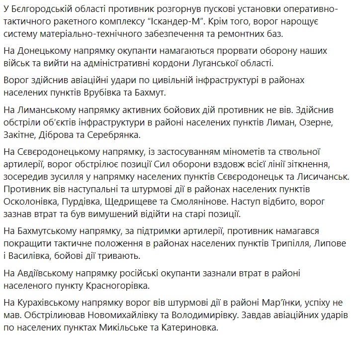 Противник пытается взять в окружение Луганскую область, продвигаясь на север от Попасной и перерезая коммуникации с Бахмутом.