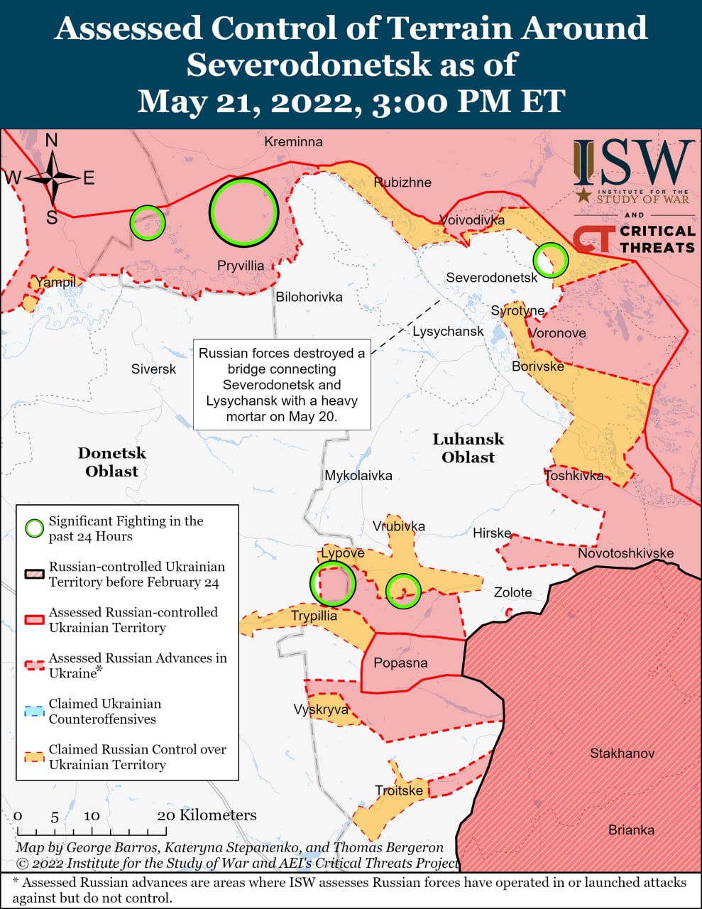 Также западные аналитики из Института изучения войны (США) публикуют карту по ситуации на основном театре военных действий - вокруг Северодонецка.