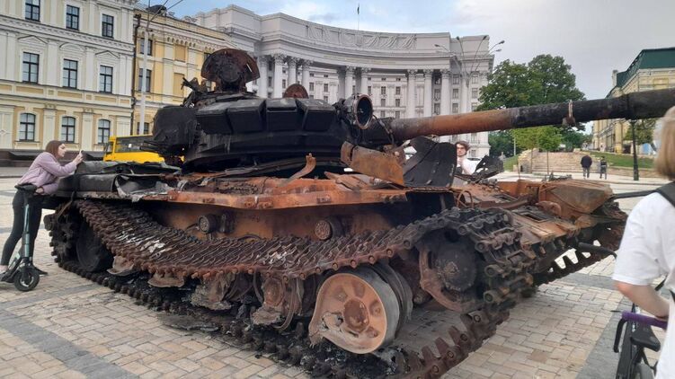 В самом центре Киева, на Михайловской площади развернута выставка российской военной техники, уничтоженной в боях.